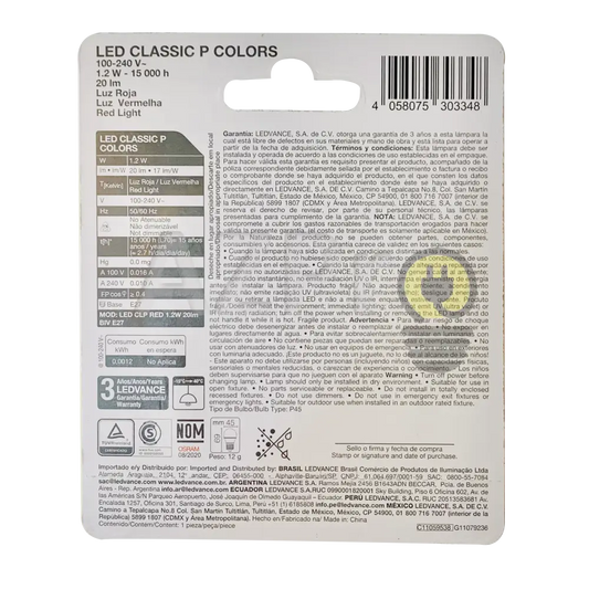 Foco Led Bulb 1.2w 120v E27 Led Classic P Decorativo Rojo 80228 Osram