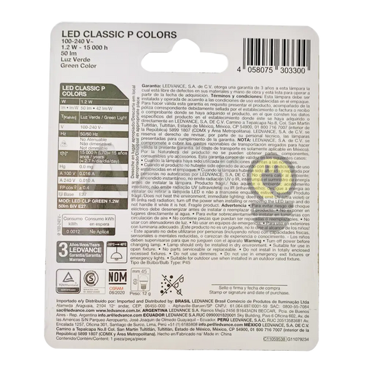 Foco Led Bulb 1.2w 120v E27 Led Classic P Decorativo Verde 80226 Osram