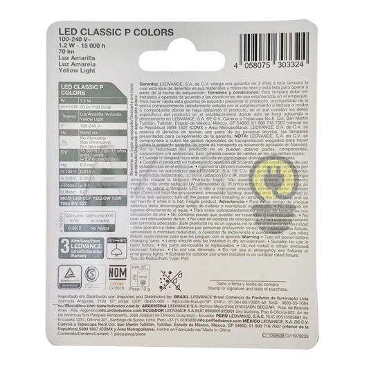 Foco Led Bulb 1.2w 120v E27 Led Classic P Decorativo Amarillo 80227 Osram